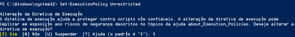 Será exibida uma mensagem informando sobre a proteção quanto à execução de Scripts. Digite “S” e pressione Enter. Conforme a imagem abaixo.